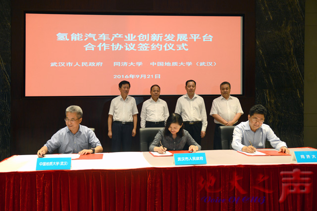 刘英姿、吕培明、王焰新共同签署《武汉市人民政府、同济大学、中国地质大学(武汉)共建氢能汽车产业创新发展平台合作协议》。