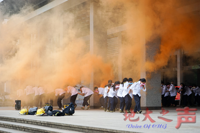 一阵橘色烟雾从主楼门口散出,消防演练正式开始。火场逃生演练中,40余名新生用毛巾捂着口鼻弯腰有序“逃出”主楼,全程不超过10秒钟。现场的消防队人员向同学们展示了云梯消防车的使用,快速地将第三层楼的被困人员救出,赢得了新生热烈的掌声。