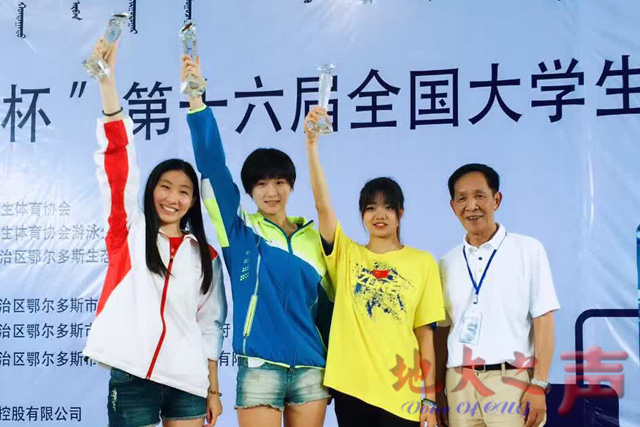 我校游泳健儿克服没有训练场馆、天气炎热等客观原因,赛前多次到东湖自然水域参加训练。在比赛中,在3名队员因参加里约奥运会而缺席的情况下,其他队员不畏强手、奋勇拼搏,展现了“地质人”的竞技风采。公共管理学院陈赞茜同学在女子甲组50米仰泳决赛中不屈不挠,勇夺桂冠;经济管理学院林琳同学在兼项“4×100米”自由泳接力、“4×100米”、“男女4×100米”混合泳接力的同时,力压群芳,连续三年获得女子甲组50米、100米自由泳金牌,成为名副其实的女子短距离自由泳“六冠王”;丁思宇、徐卉一、张文清、姜雨“四朵金花”在“4×100米”混合泳、“4×200米”自由泳接力决赛中以绝对优势摘得两枚金牌。