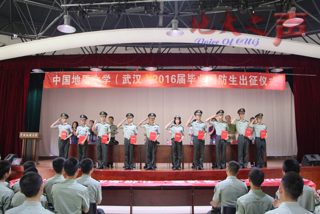 (通讯员吴畏)7月12日上午,我校2016届毕业国防生出征仪式在大学生活动中心二楼召开,111名国防生接受了派遣命令,把青春热血与祖国紧密相融。校党委副书记傅安洲,驻湖北高校选培办主任李庆云、副主任刘雄平,学工处、相关学院负责人等参加仪式。
