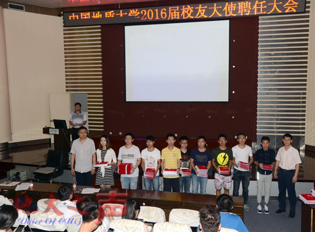 校友与社会合作处副处长李门楼宣读了《中国地质大学(武汉)校友与社会合作处关于聘任2016届校友大使的决定》。