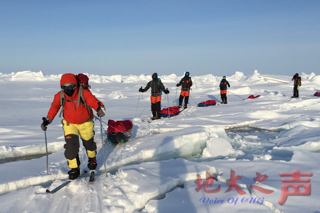 4月12日凌晨,登山队一行6人由北京启程飞往挪威朗伊尔城,经过两天的前期准备,检查并补充了极地徒步所需的相关装备。由于博内奥北极营地机场冰层情况不稳定,出现了四次冰裂。在等待两天后,队员们于17日18时47分由朗伊尔城飞往博内奥营地。但由于冰况逆向漂移,队员们被迫取消了原定宿营点,换乘直升机飞抵徒步起始点。一路上,队员们在零下四十至五十度的极低温度下,冒着凛冽的寒风甚至是暴风雪行走在布满冰裂缝的线路上,有队员出现了冻伤的情况,甚至有队员在睡梦中差点掉进冰裂缝。
