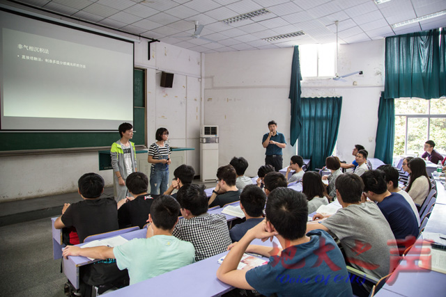 (记者 徐燕 通讯员 程旬 白振洋 摄影 王宇涵)“改变光纤折射率用什么方法呢?如果在石英中掺入折射率高于石英的掺杂剂, 就可以制作光纤的纤芯。”4月15日,在教三楼208室材料与化学学院沈毅副教授的课堂上,李缘、丁卉雨、谭玉洁、匡伟兵、刘瑶瑶5位同学走上讲台,与80余名同学玩起了互动。