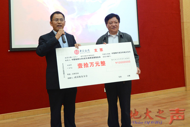 熊友辉代表第三届武汉校友分会向学校捐款10万元,用于校友“地大杯”等文体活动的开展。