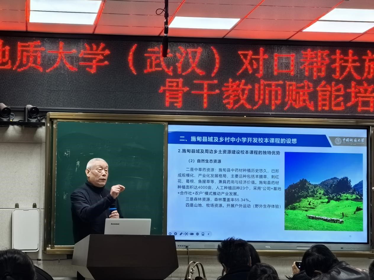 中国地质大学(武汉)专家团队为培训注入新动能。傅安洲教授以《中小学校本课程的开发与运用》为题,指导教师系统挖掘好地方特色资源,开发校本课程,让学生留住乡愁。