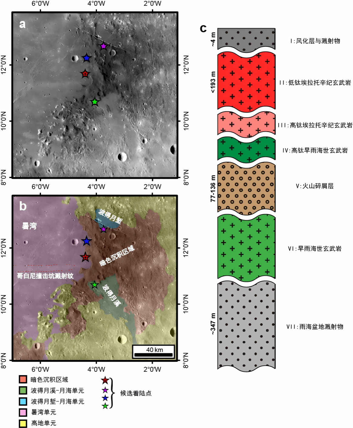 波得月溪群区域位置与地层情况。(a)波得月溪群区域及建议着陆点示意图。底图为嫦娥一号高程数据绘制的月球正面地形图。(b)研究区的地质单元划分。(c)波得月溪群区域暑湾单元地层柱状图。