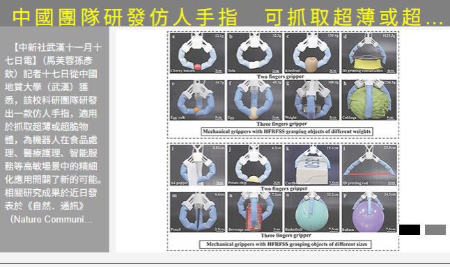 【中新社武漢十一月十七日電】(馬芙蓉孫彥欽)記者十七日從中國地質大學(武漢)獲悉,該校科研團隊研發出一款仿人手指,適用於抓取超薄或超脆物體,為機器人在食品處理、醫療護理、智能服務等高敏場景中的精細化應用開闢了新的可能。